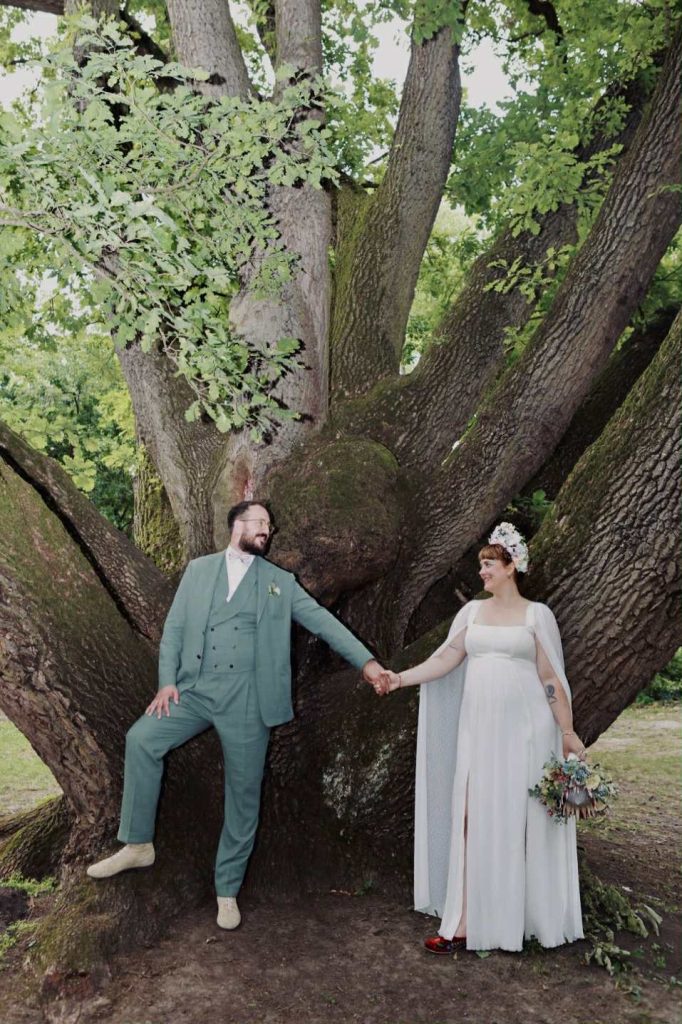 Eliza: Az én gyűrűmön hét csillag van, mint a magyar népmesékben a Hét Szépség, a tündérek birodalmából visszatükröződő áldás. Amúgy a nyolc a szerencseszámom, és nagyon kedves, hogy a nyolcadik csillag Albert gyűrűjén van, ez azt szimbolizálja, hogy az egységünkkel tudjuk teljessé tenni az életünket. Albert csillaga egy igazi csillagot is tükröz, ami mutatja az utat, mint a matrózoknak az Északi-sarkcsillag. Szükségünk van rá, mert ez egy hosszú utazás, amin haladunk együtt. A belső oldalon a vésett tölgyfa levél motívum pedig azt a helyet idézi meg, ahol kimondtuk az igent. Lett egy különleges tölgyfánk a Gellért-hegyen, és a másik az esküvő helyszínén, Pusztazámoron, egy 350 éves tölgy, aminek a lombkoronája volt a ceremóniánk temploma.